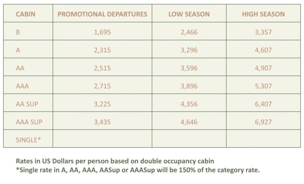 2 passengers $6,080 p/person Double Occupancy + AUSTRALIS CRUISE cost that will vary according to cabin category Group of 4 passengers $5,489 p/person Double Occupancy + AUSTRALIS CRUISE cost that will vary according to cabin category